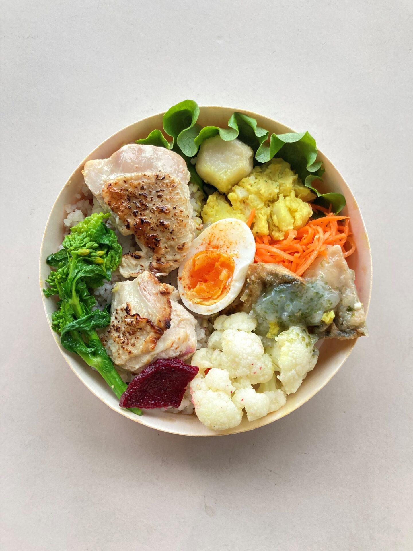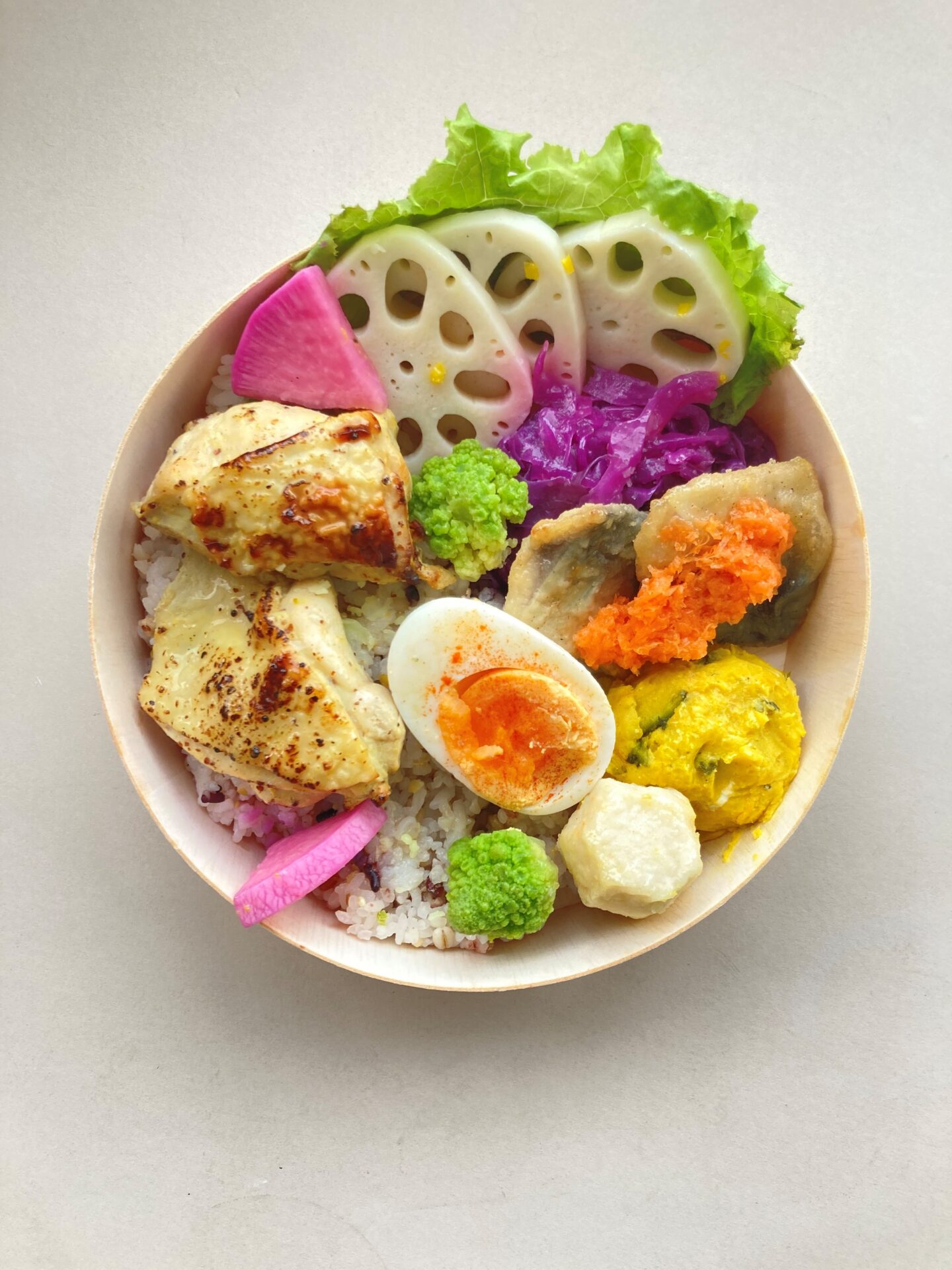 月替わりのチキンローストとお魚、野菜のおかずがついた ボリューム満点のプレート ご飯、お味噌汁、サラダ付き